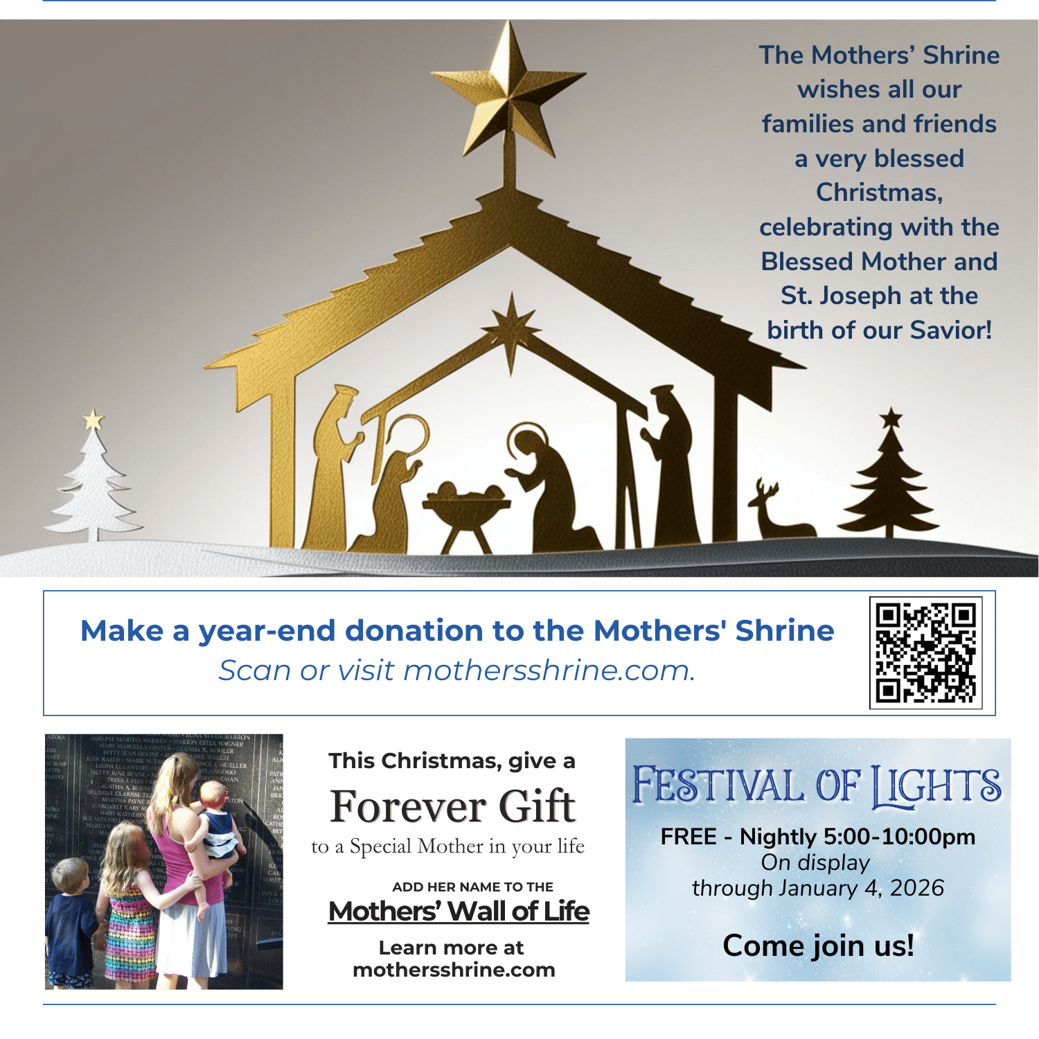 † We receive no federal, state or church funding and rely solely on private contributions and the generosity of individual donors. The National Shrine of Mary, Mother of the Church is exempt from federal income taxes under Section 501(c)(3) of the Internal Revenue Code. Your gift is tax-deductible to the full extent provided by law. EIN 43-1849868