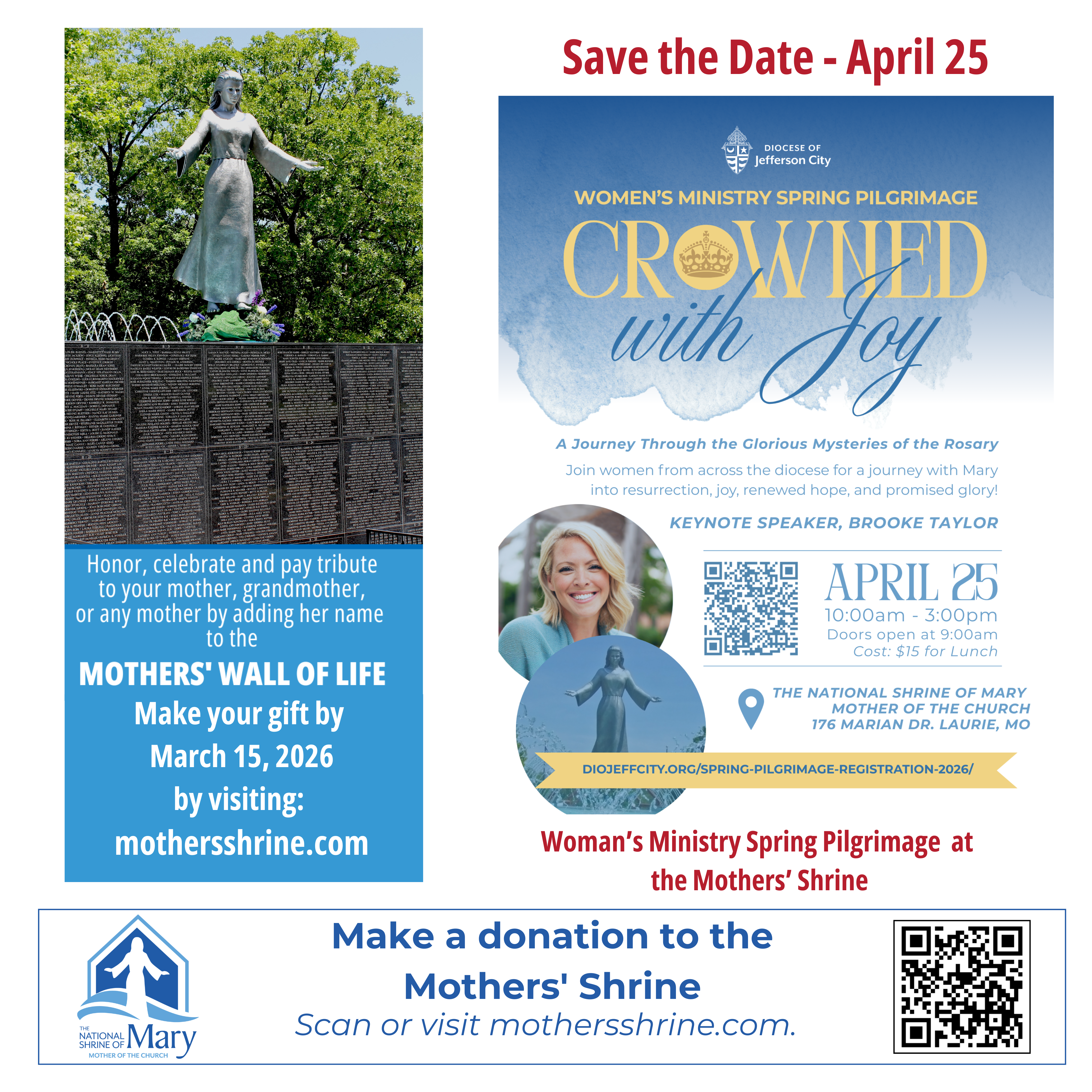 † We receive no federal, state or church funding and rely solely on private contributions and the generosity of individual donors. The National Shrine of Mary, Mother of the Church is exempt from federal income taxes under Section 501(c)(3) of the Internal Revenue Code. Your gift is tax-deductible to the full extent provided by law. EIN 43-1849868