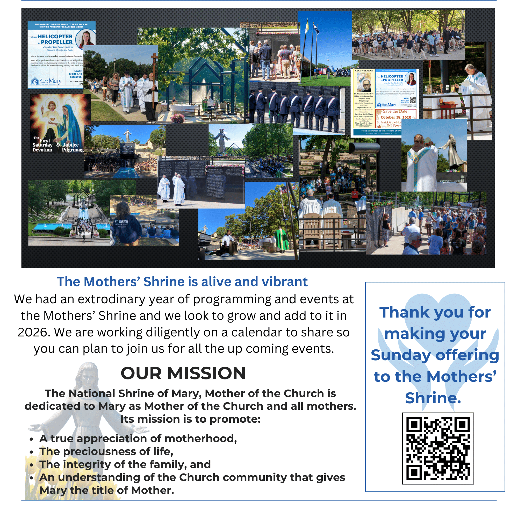 † We receive no federal, state or church funding and rely solely on private contributions and the generosity of individual donors. The National Shrine of Mary, Mother of the Church is exempt from federal income taxes under Section 501(c)(3) of the Internal Revenue Code. Your gift is tax-deductible to the full extent provided by law. EIN 43-1849868